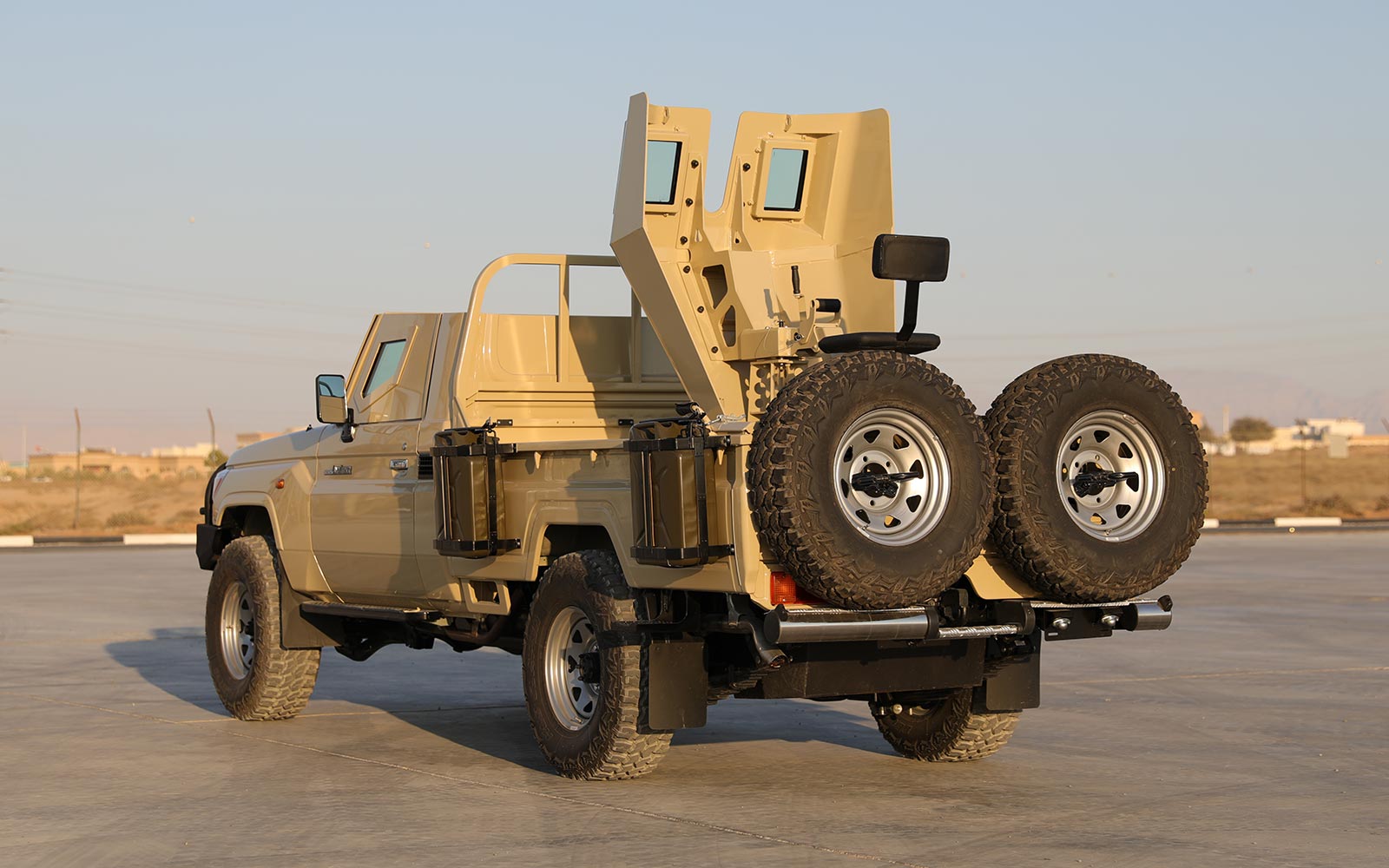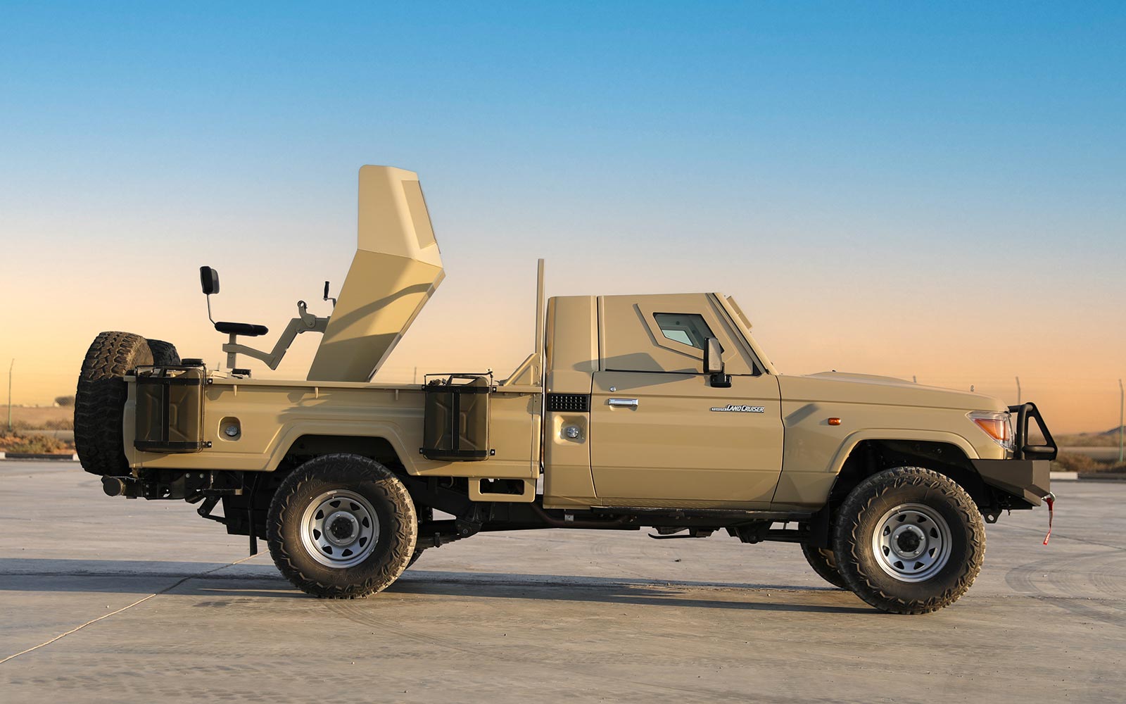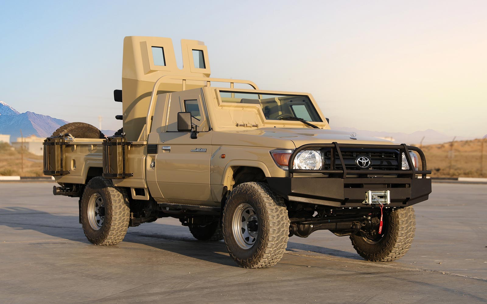 The armored Toyota Land Cruiser 79 Series is designed as a light weight tactical vehicle, partially armored vehicle with an open roof for rapid action and response. It has a numerous added safety features that have never been seen on Toyota Land Cruiser series such as the monocoque V-Hull compartment (for crew), its engine is fixed separately from the armored cabin and transfer case, both are protected by a V-shape cover. Together with the 360 Degrees gun stand in the back of the vehicle, the TLC-79 is prepared for close and long range combat. The TLC-79-LRTV is equipped with an upgraded fuel tank with added fuel capacity for long range operations.
