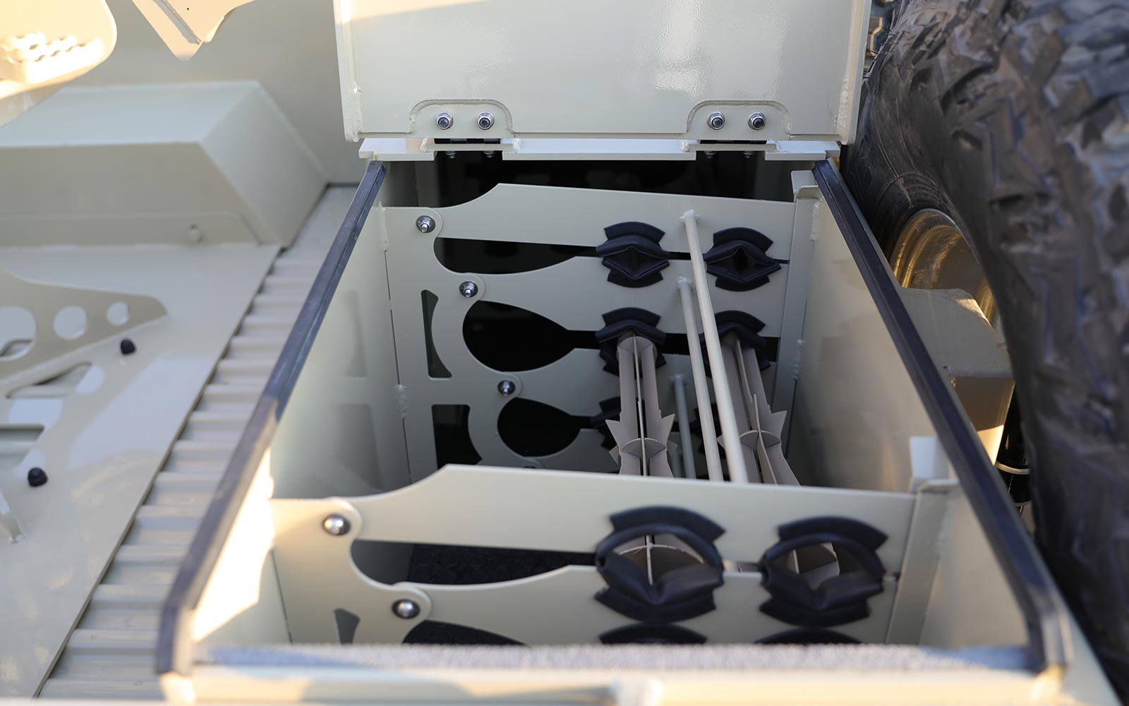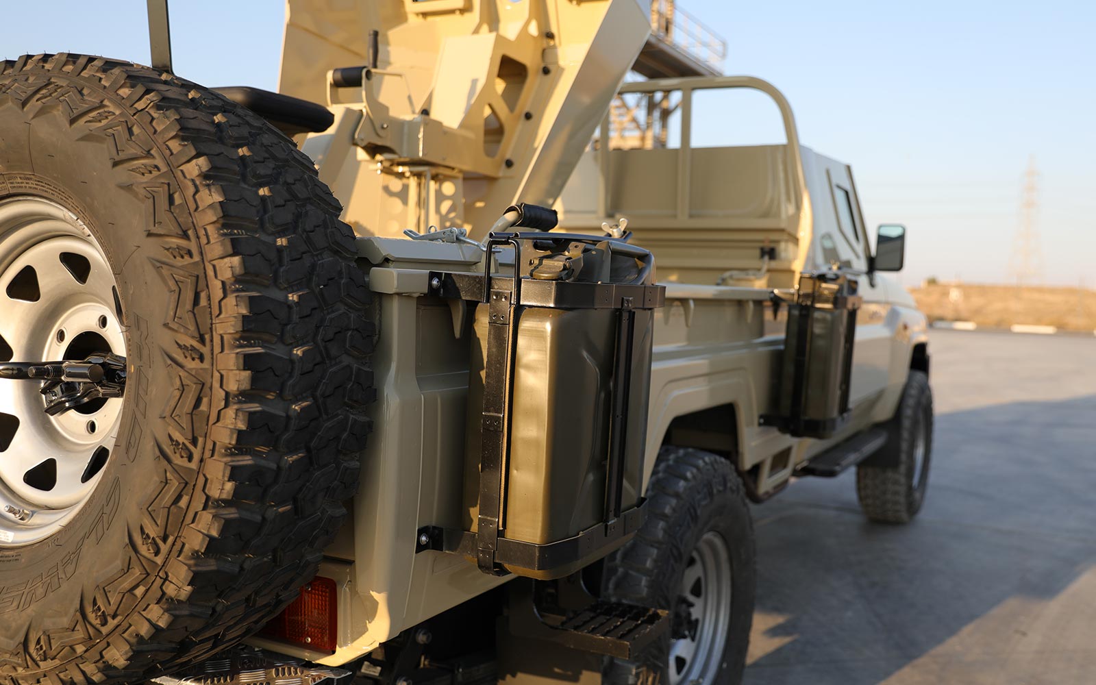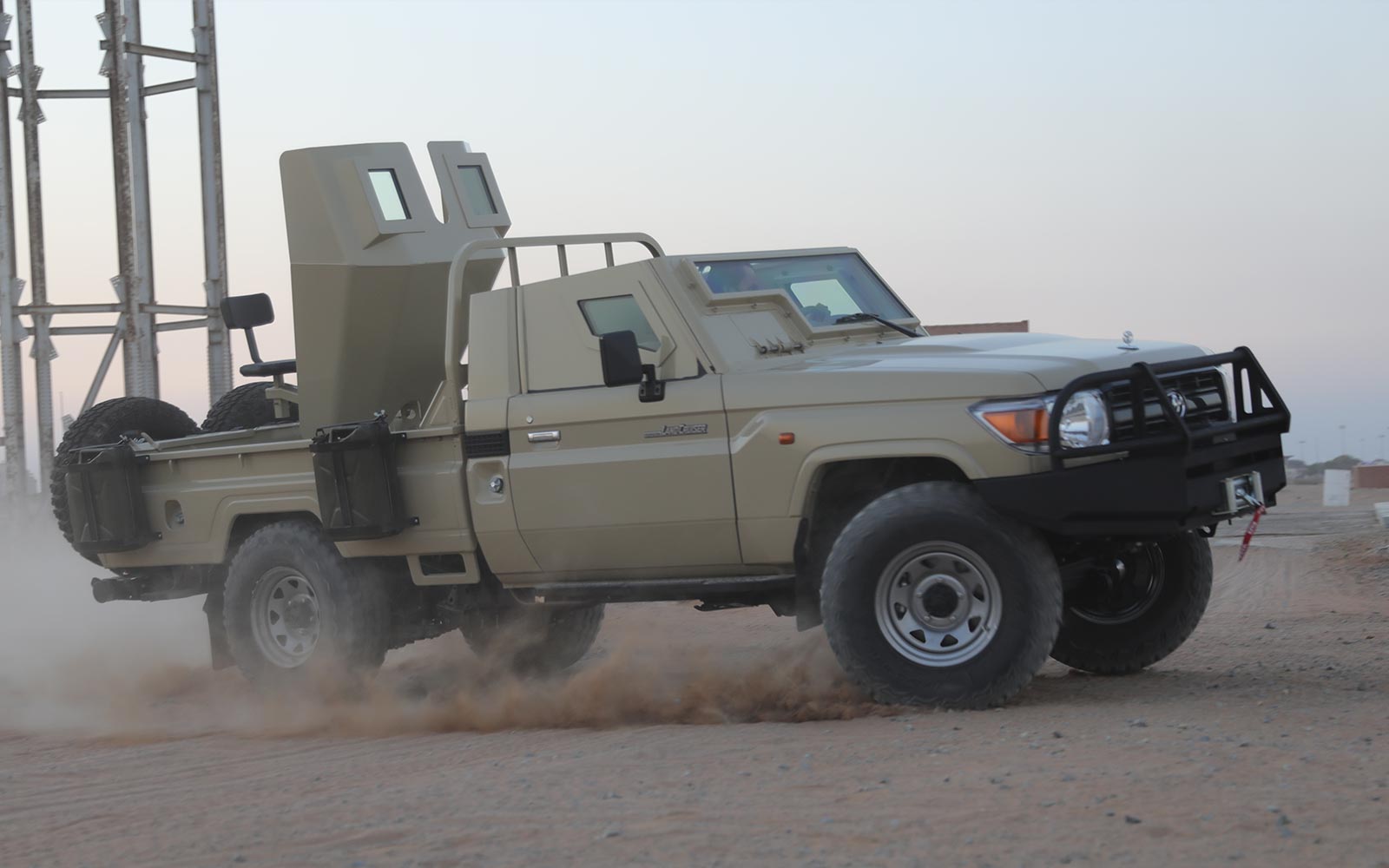 The armored Toyota Land Cruiser 79 Series is designed as a light weight tactical vehicle, partially armored vehicle with an open roof for rapid action and response. It has a numerous added safety features that have never been seen on Toyota Land Cruiser series such as the monocoque V-Hull compartment (for crew), its engine is fixed separately from the armored cabin and transfer case, both are protected by a V-shape cover. Together with the 360 Degrees gun stand in the back of the vehicle, the TLC-79 is prepared for close and long range combat. The TLC-79-LRTV is equipped with an upgraded fuel tank with added fuel capacity for long range operations.